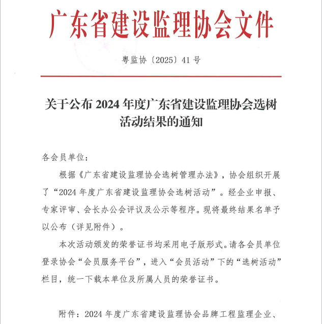 近日,从广东省建设监理协会传来喜讯:在协会组织的2024年度广东省建设监理协会选树活动评选中,我司凭借卓越的服务品质、规范的工程管理与良好的行业口碑,成功获评2024年度广东省建设监理协会“品牌工程监理企业”!